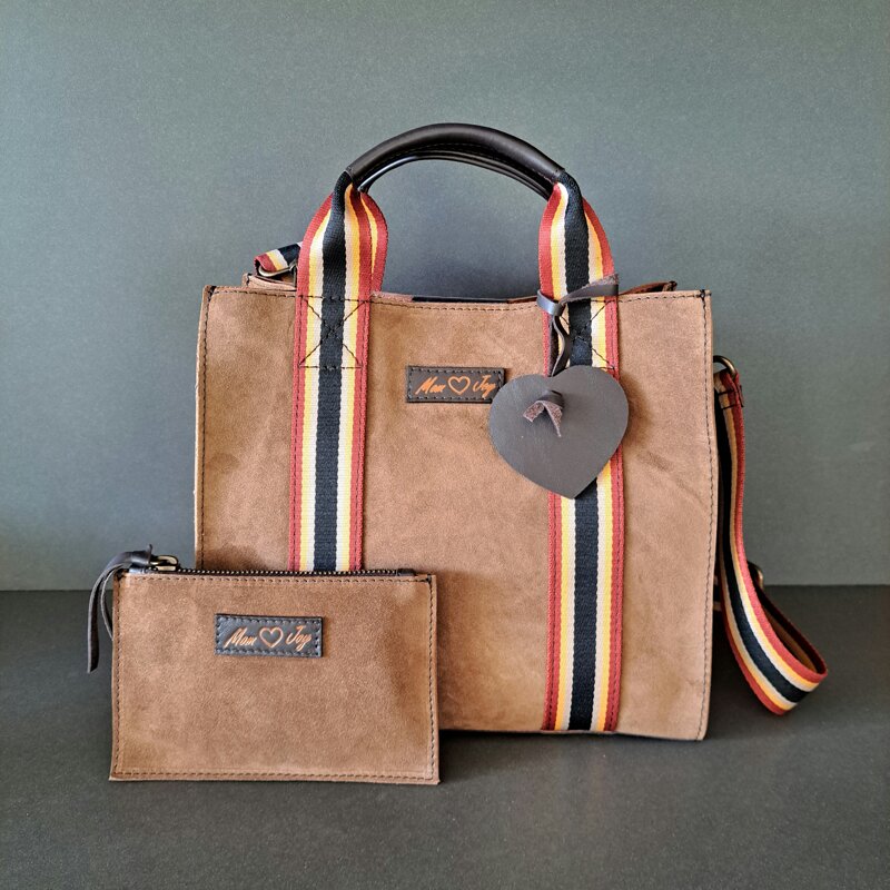 Manici in cotone e PE color senape/bruciato/nero, rivestiti in pelle testa di moro