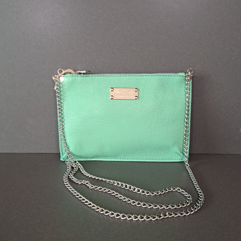 Mini Pochette piatta in vera pelle con tracolla in catena color acciaio, Ideale per avere le mani sempre libere.