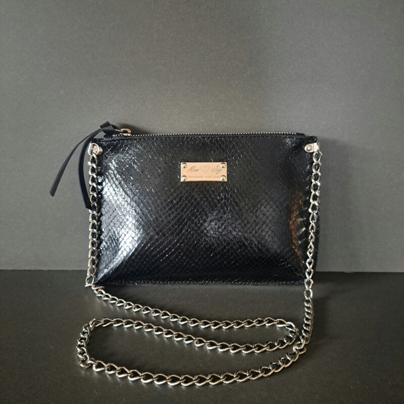 Pochette a tracolla in vera pelle stampa "snake" lucida colore nero.